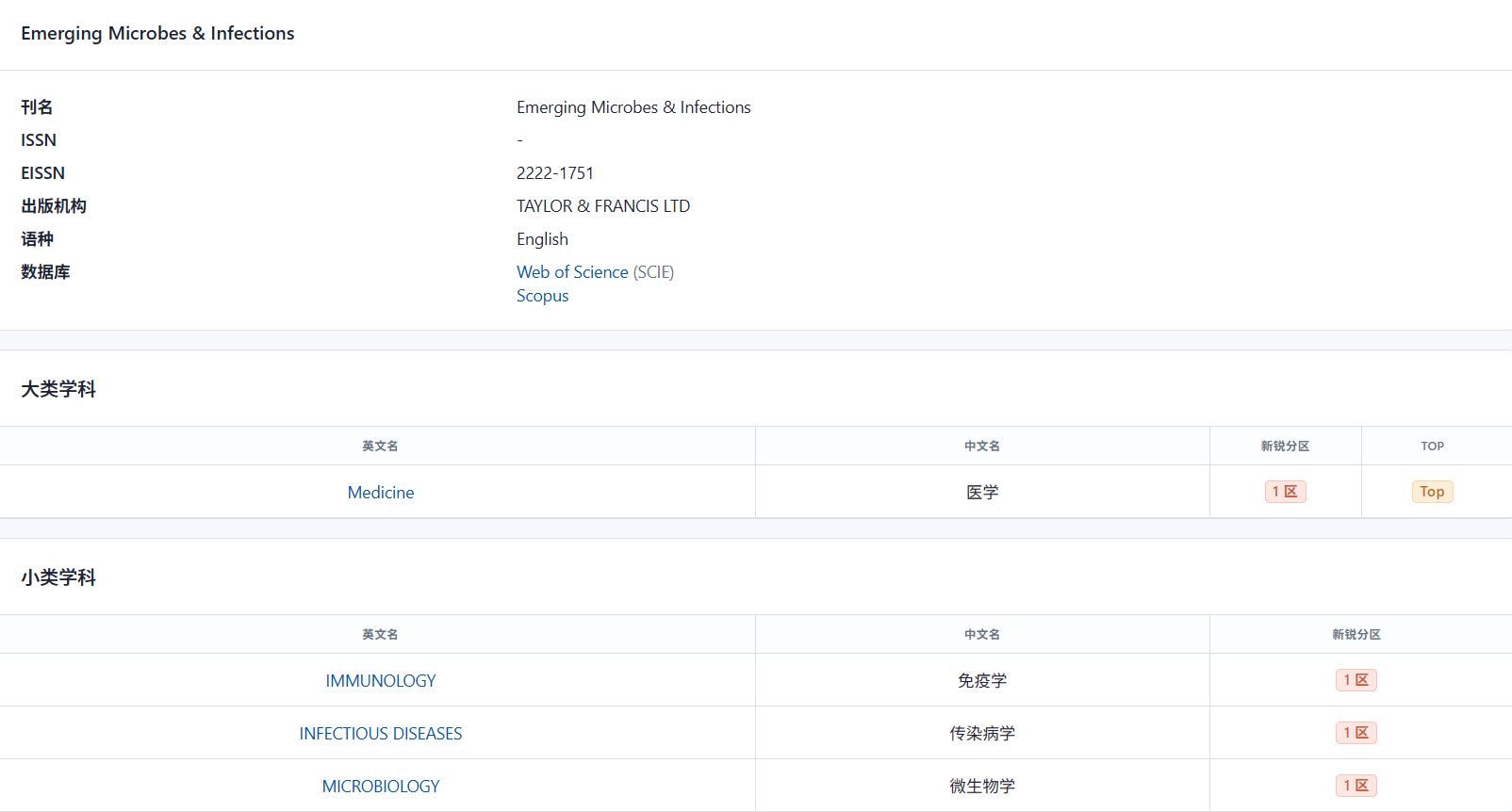 According to the latest 2026 XinRui Journal Ranking results, Emerging Microbes & Infections (EMI) ranks T1 Top in the major category of Medicine. In the subcategories of Immunology, Infectious Diseases and Microbiology , it also ranks in T1 across the board. This achievement further consolidates EMI’s leading position as an international high-impact flagship journal in the fields of emerging infectious diseases, providing important references on the most recent progress of scientific research in this area.
