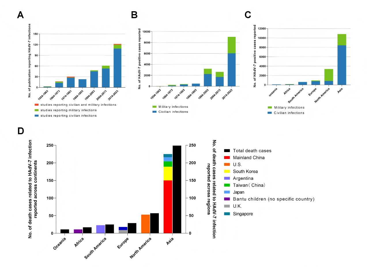 This study is the first to systematically elucidate the epidemiological patterns, pathogenic characteristics, and evolutionary dynamics of HAdV-7 over the 70 years since its discovery through large-sample meta-analysis and whole-genome evolutionary research, addressing the long-standing lack of comprehensive data in this field. The findings underscore that HAdV-7 is the most significant adenovirus type causing severe illness and death in children, highlighting the urgent need to develop effective vaccines and antiviral drugs to counter its ongoing threat.