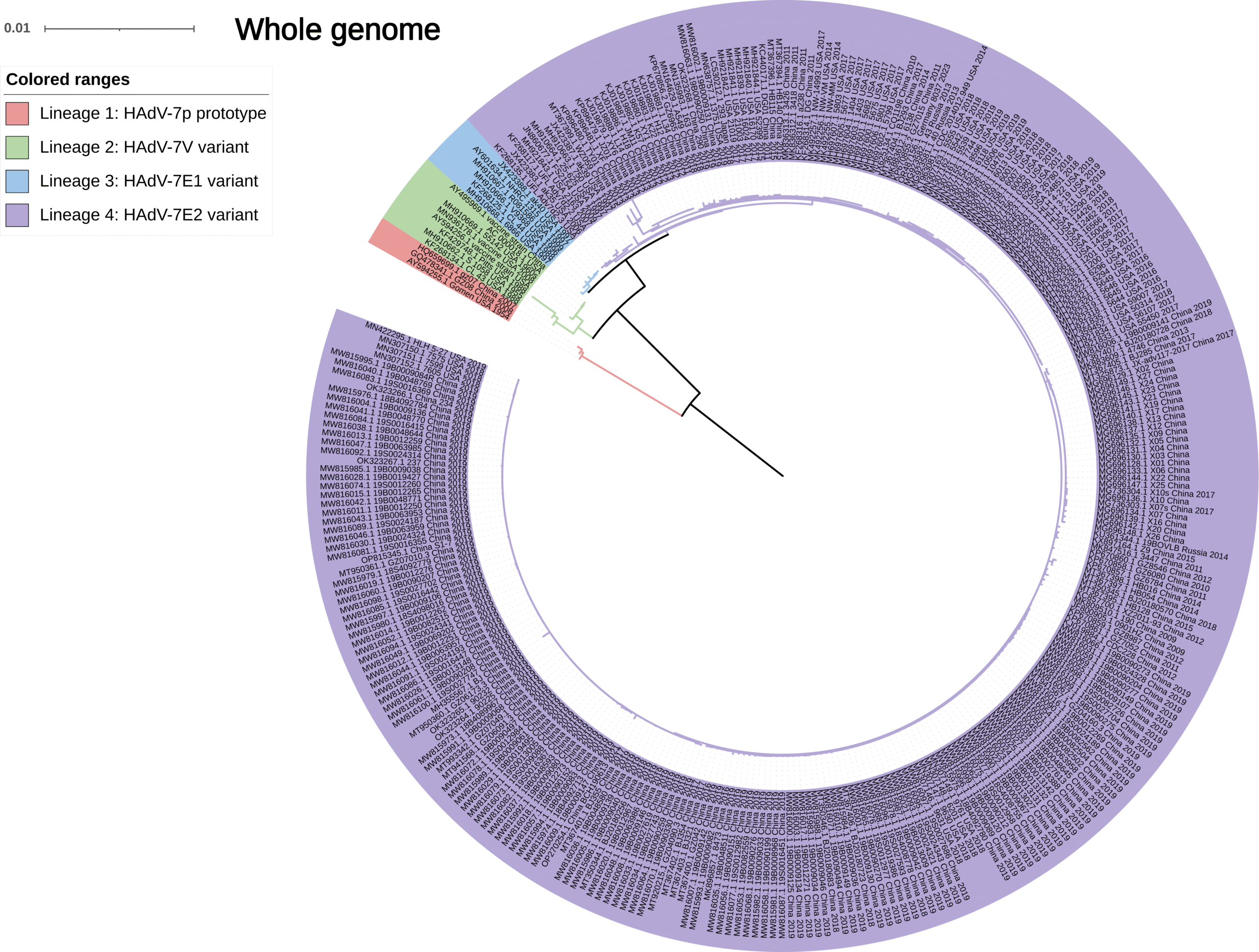 Human adenovirus type 7 (HAdV-7) is a significant pathogen responsible for severe respiratory infections in children and military personnel. First identified in 1954, HAdV-7 has caused outbreaks worldwide. Particularly during 2018–2019, it triggered multiple pediatric pneumonia outbreaks across several provinces in China, resulting in dozens of child fatalities.