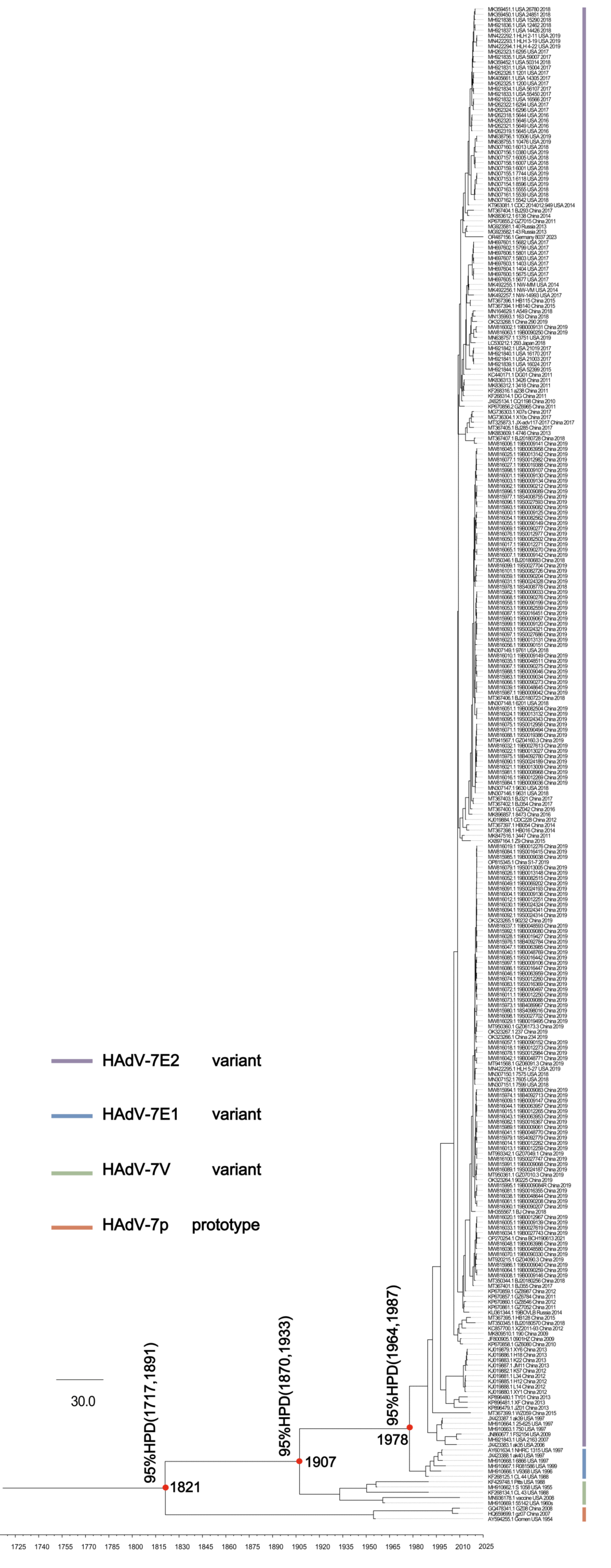Phylogenetic analysis revealed that HAdV-7 can be classified into four major lineages (Figure 3), including the 7p prototype, the 7V vaccine strain, and the 7E1 and 7E2 variants. Among these, the 7E2 variant has become the predominant circulating strain globally since 2005 and is associated with a higher number of fatalities (91 deaths, accounting for 67.91%). Using Bayesian methods, the study also estimated the evolutionary rate of HAdV-7 (3.89 × 10⁻⁵ mutations/site/year) and predicted that new variants emerge approximately every 70–80 years, with the next variant likely to appear around 2048 (Figure 4).